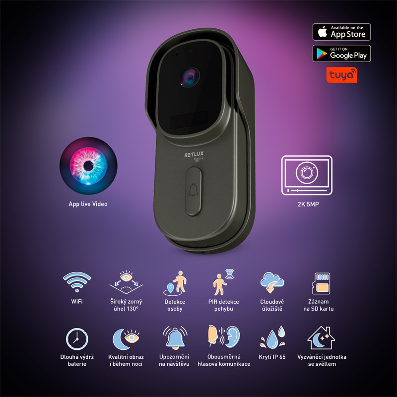 Se širokým pozorovacím úhlem 130° budete mít dobrý přehled o dění venku. Video zvonek se bezdrátově připojuje k internetu a prostřednictvím aplikace RETLUX pro Android a iOS ho můžete pohodlně ovládat z mobilního telefonu. Můžete sledovat živý přenos z kamery, dostávat upozornění na pohyb osob a využívat obousměrnou hlasovou komunikaci s potlačením šumu ve vysoké kvalitě – full duplex.