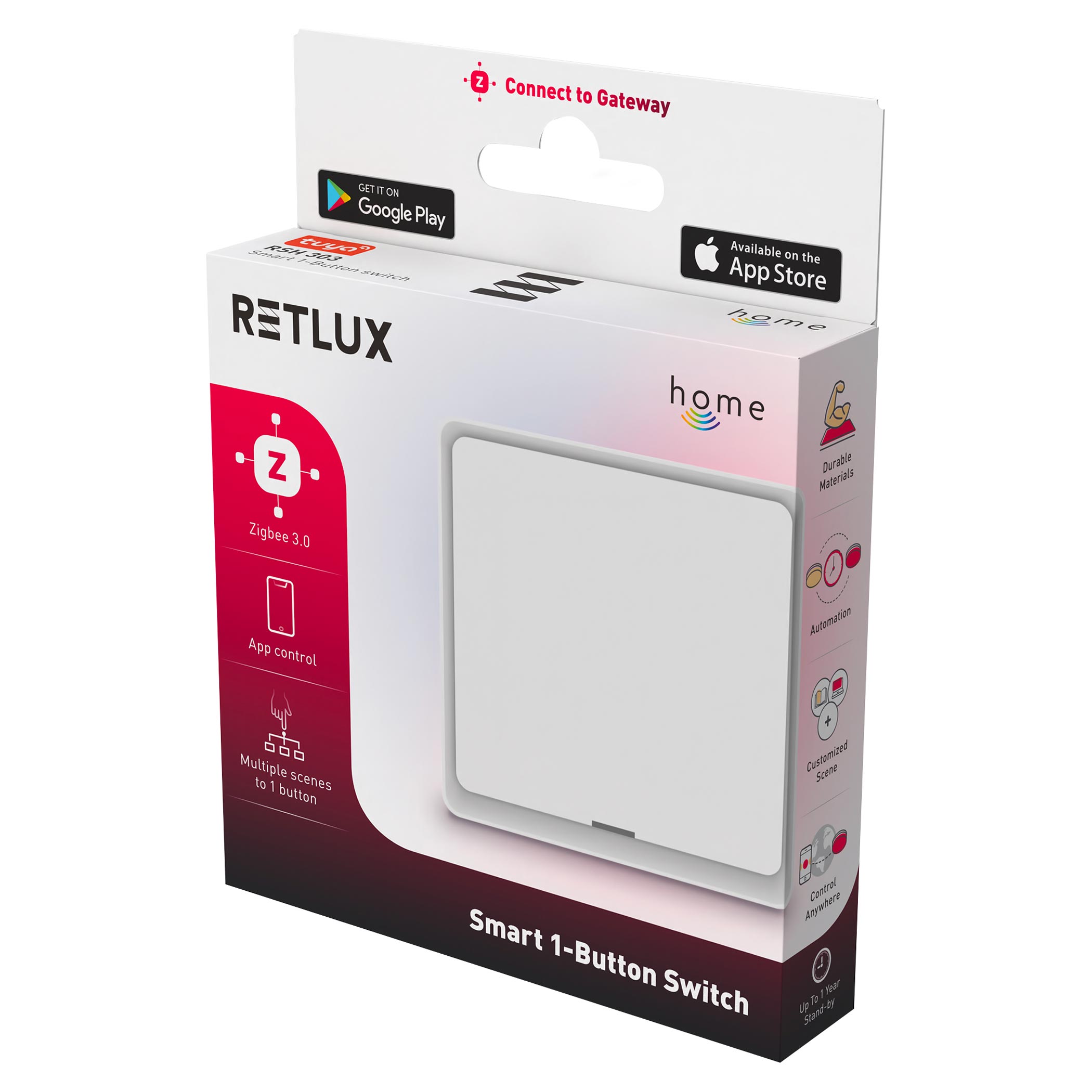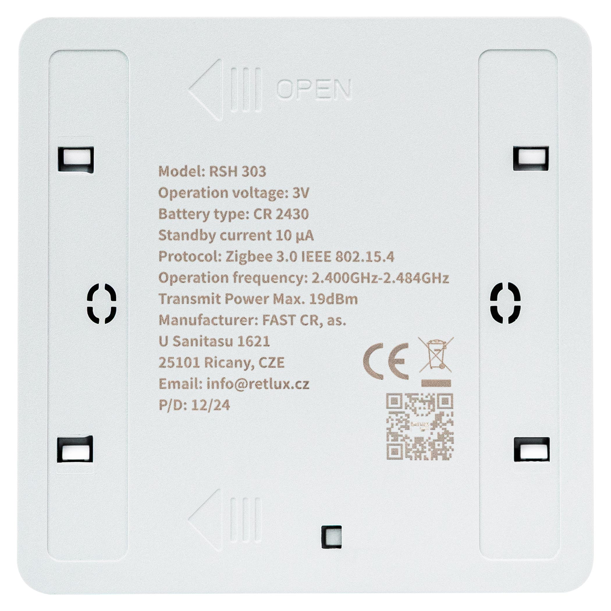 RSH 303 je chytré scénické tlačítko s technologií ZigBee 3.0, které umožňuje snadné a rychlé ovládání chytré domácnosti včetně světel, žaluzií nebo zásuvek. Díky lehké a přenosné konstrukci ho lze umístit kamkoli, přičemž tři režimy ovládání (stisk, dvojstisk, podržení) umožňují přiřadit více funkcí k jednomu tlačítku. Je kompatibilní s hlasovými asistenty Google Home a Alexa, ovladatelné přes aplikaci RETLUX home a k provozu vyžaduje ZigBee gateway. Tlačítko má dlouhou výdrž baterie a nízkou spotřebu energie, což z něj činí spolehlivého a flexibilního pomocníka pro každou moderní domácnost.