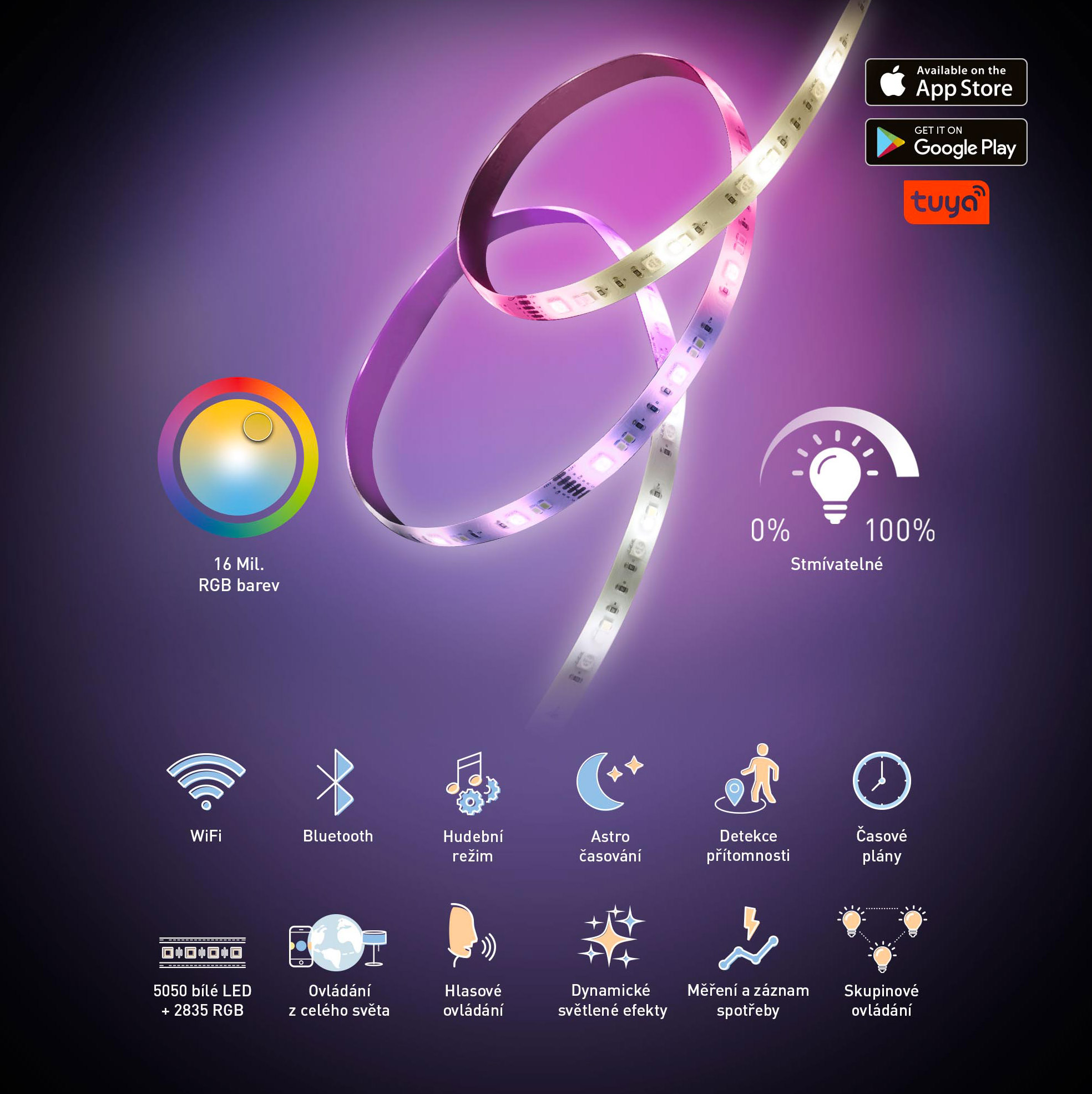 Osvětlení vaší domácnosti můžete mít jednoduše pod kontrolou. Chytrý LED pásek lze ovládat z vašeho telefonu přes aplikaci RETLUX Home, která je dostupná pro iOS i Android. Díky ní lze nastavit samotné osvětlení, jako je barva, intenzita apod., ale i scénáře, časovače a integraci s dalšími chytrými prvky v domácnosti. Světlo tak budete mít připravené pro každou situaci. Postará se o to 450 LED diod na 5 metrech délky.