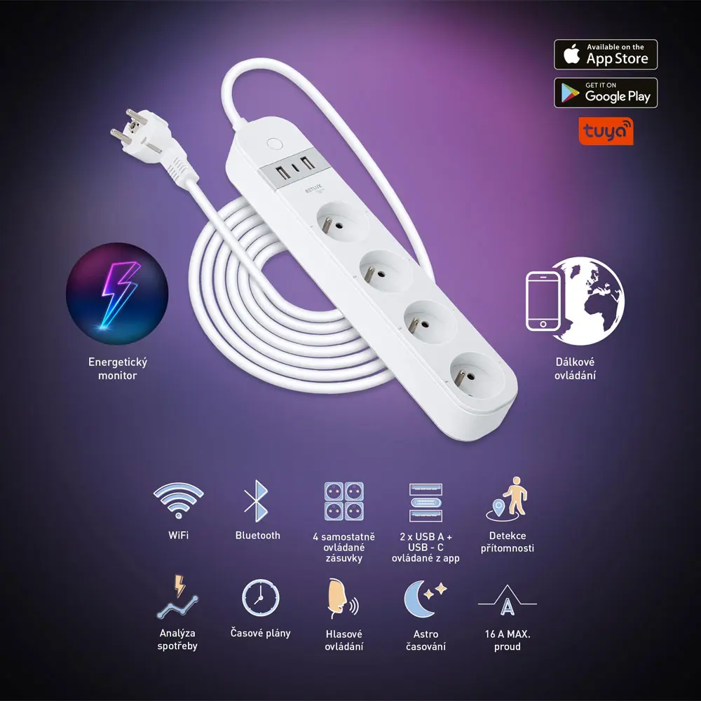 Wi-Fi SMART prodlužovací přívod FR 16A Retlux RSH 202 je užitečný nástroj pro správu vašich elektrických a elektronických zařízení. Umožňuje vám ovládat a nastavovat časování každé ze 4 zásuvek, stejně jako napájecí a nabíjecí USB-A a USB-C porty, přímo z mobilního telefonu.